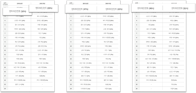 이번 캠페인을 성공적으로 이끌기 위해 2040남녀 유튜브 검색 순위를 분석했고, 이를 통해 타겟은 <엔터테인먼트> 요소를 찾고 있음을 확인할 수 있었습니다.