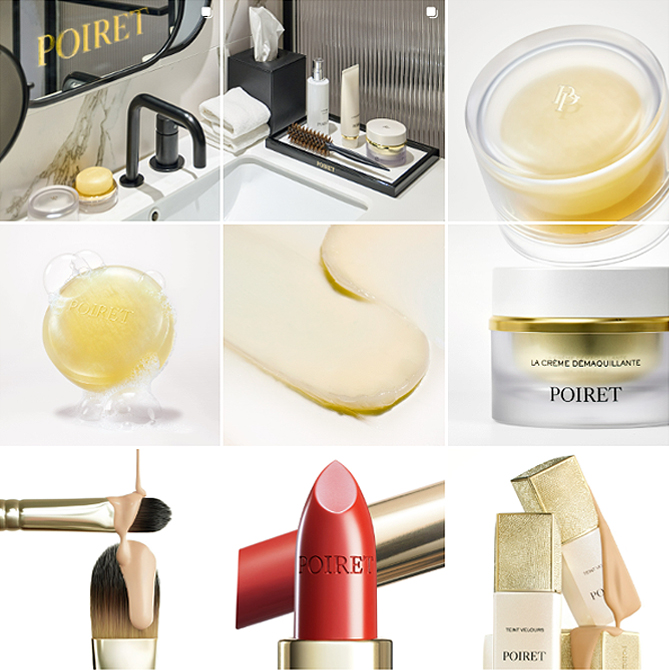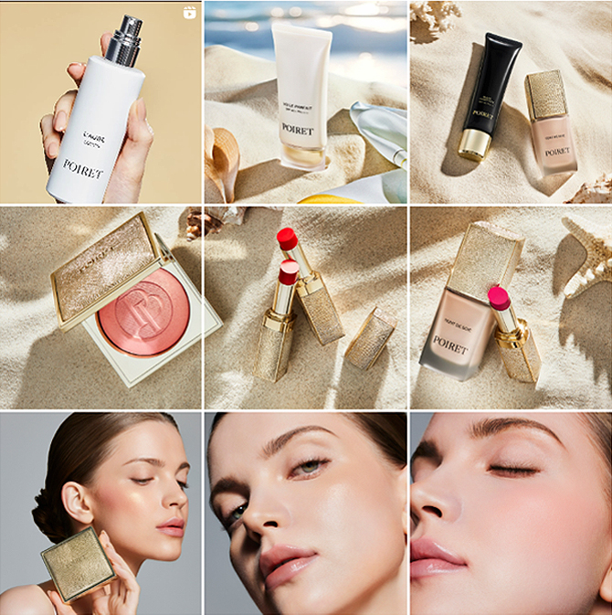 ‘SUMMER POIRET LOOK’ 시즌(스프링, 썸머, 바캉스, 홀리데이 등) 및 주력 제품에 적합한 컨셉으로 여러 제품을 함께 놓고 하나의 리추얼로 소개하였습니다. 여름휴가, 해변에서 즐기는 럭셔리 썸머 메이크업 뿐만 아니라 은은한 베이지톤 모래 배경 위에 제품들을 배치해 반짝이는 패키지를 강조하였습니다.