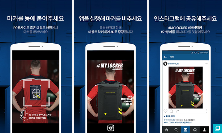 스티커 형태의 마커는 전국 매장 혹은 데상트 이벤트 사이트를 통해 받을 수 있으며, 데상트 APP은 구글 플레이스토어(안드로이드만 참여 가능)를 통해 다운로드가 가능합니다 2016년 핫 미디어 AR을 활용한 #MY LOCKER 스포츠 백팩 홍포캠페인, 앞으로도 많은 관심과 참여 바랍니다.