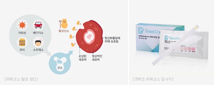 사람이 활동에 필요한 에너지를 얻으려면 섭취한 음식물과 호흡을 통해 들어온 산소가 결합하는 대사활동이 일어나야 합니다. 이상적인 대사는 이런 에너지원과 산소가 균형을 이루는 것인데 과도한 운동이나 폭음, 흡연, 과식, 스트레스 등의 이유로 균형이 깨지면 체내 산소는 남거나 부족해지는 불안정한 상태로 바뀝니다. 이러한 산소의 찌꺼기가 바로 유해산소(활성산소)입니다. 굿체크는 체내 유해산소 수치를 확인하고 관리할 수 있도록 도와주기 때문에 건강관리를 위해서는 본 검사가 꼭 필요할 것입니다.