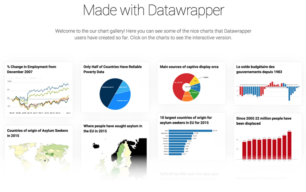 Datawrapper는 스토리에 데이터의 팩트를 더할 수 있도록 도와줍니다. 다양한 인터렉티브 한 그래픽차트를 만들 수 있도록 도와 주어 다양한 미디어를 통해 기업의 내부보고서를 작성하는 경우 큰 장점이 있습니다. 이 앱은 차트처럼 단순해 보이지만, 온라인 또는 CSV 파일 데이터를 업로드하고 원하는 차트 유형을 선택하기만하면 원하는 차트가 자동으로 생성되어 대량의 시각화 타입을 만들어야 하는 경우 큰 장점을 발휘할 수 있습니다.