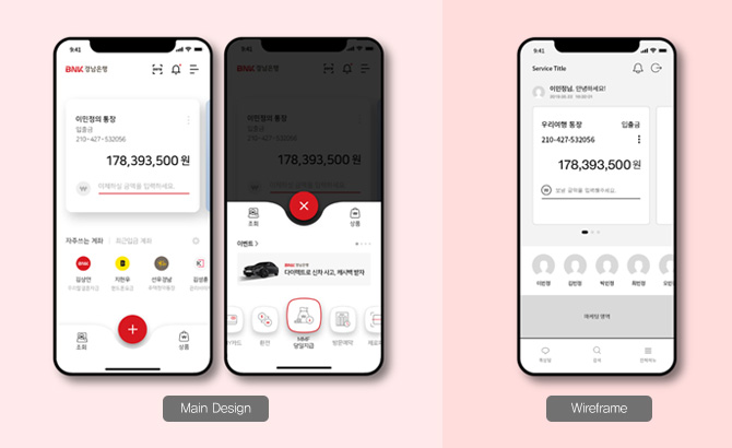 이번 경남은행 통합 리뉴얼 프로젝트는 디자인팀에서 메인화면의 콘셉트와 아이디어를 전적으로 선 작업 후 제안했습니다. 동시에 메인화면 이후의 중요 페이지들의 요건과 화면구성을 기획했습니다.