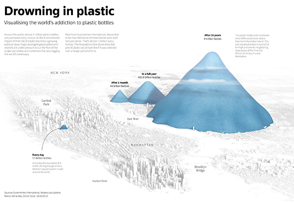 전 세계적으로 1분에 1백만 개에 가까운 플라스틱병이 구매되고 있으며, 이는 환경에 파괴적인 영향을 미치고 있습니다. 이에 플라스틱 사용 절감을 권고하고자 Reuters Graphics 팀은 플라스틱병 판매 데이터를 시각화하여 시간의 흐름별 수집된 플라스틱 더미가 어떤 모습 일지 보여주었습니다.