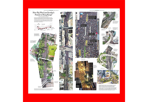 2019년부터 홍콩 자치 정부의 도주 범죄인 및 형사법 관련 법률 지원 개정안 도입에 반대하는 홍콩 시민들의 행진 시위가 있었습니다. 이번 수상작은 시위의 스케일을 표현하기 위해 100개 이상의 사진과 비디오를 합성하여 단일 이미지로 병합하여 만든 인포그래픽을 제시하였습니다.