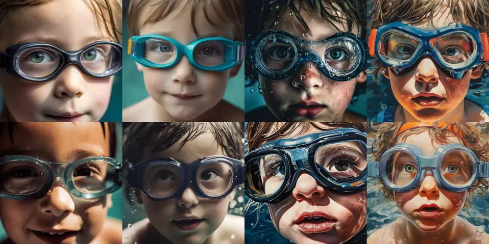 ‘수영용 고글을 쓴 아이의 클로즈업’를 생성한 미드저니 5.0(왼쪽 4개 이미지) 대 5.1(오른쪽 4개 이미지) (사진=배리 콜린스/미드저니) / 출처 : AI타임스(https://www.aitimes.com)