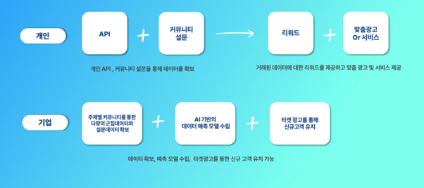 정보주체와 데이터 수요기업 간 데이터 거래를 중계하여 리워드 및 맞춤형 서비스 제공