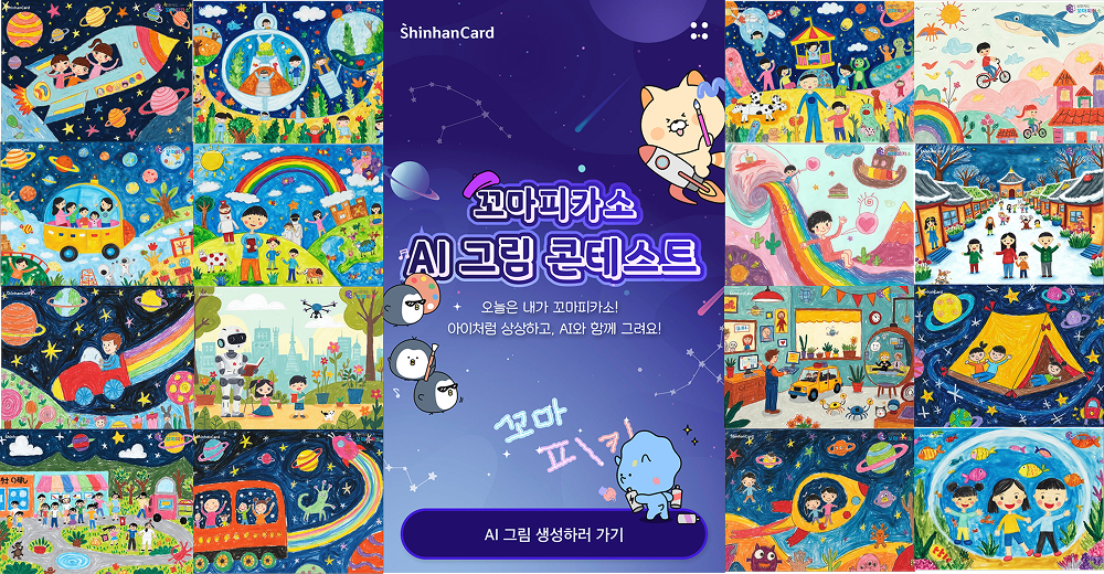 신한카드의 대표 문화행사인 ‘꼬마피카소 그림축제’의 사전 이벤트로 진행된 이번 콘테스트는, 참가자들이 온라인에서 AI를 활용해 어린이가 그린 듯한 따뜻하고 자유로운 질감의 그림을 직접 생성해보는 체험형 이벤트이다.