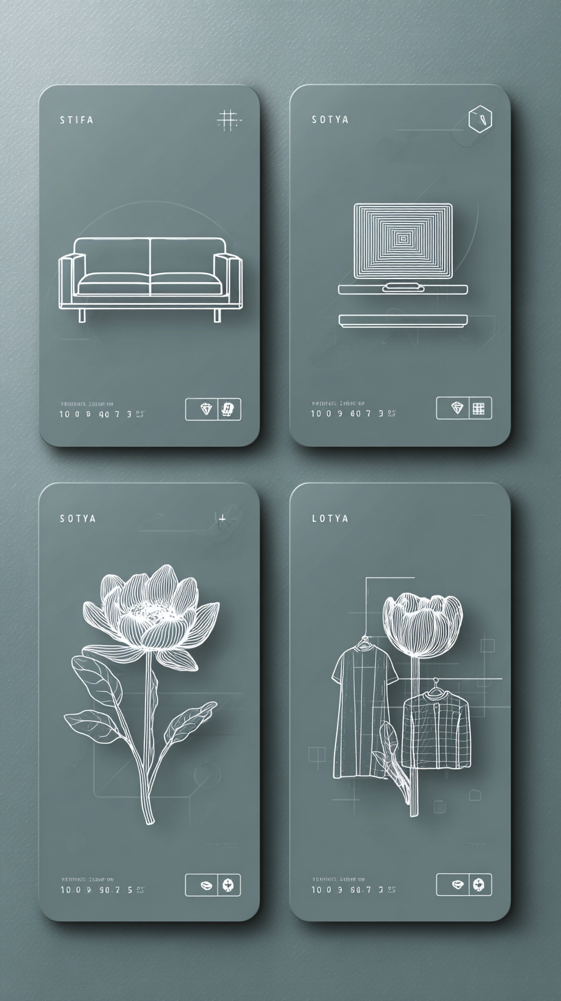 modern loyalty card design, matte background with subtle line icons (sofa, TV, clothing, flower, shopping cart), geometric minimal pattern, soft-touch effect, stylish sans-serif text, clean and contemporary retail identity