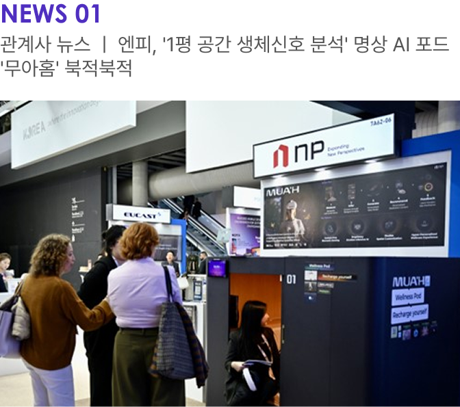 코트라(KOTRA) 한국관에 부스를 마련한 엔피는 확장현실(XR), AI, 바이오 기술을 집약한 1인용 포드(POD) 형태의 무아홈을 시연했다. 무아홈은 3.3제곱미터(㎡) 규모의 독립 공간에서 사용자의 생체 데이터를 측정하고 최적의 회복 경험을 제공하는 공간형 솔루션이다. 현장에서는 많은 관람객들이 무아홈을 들락날락 거리는 모습을 자주 목격할 수 있다.