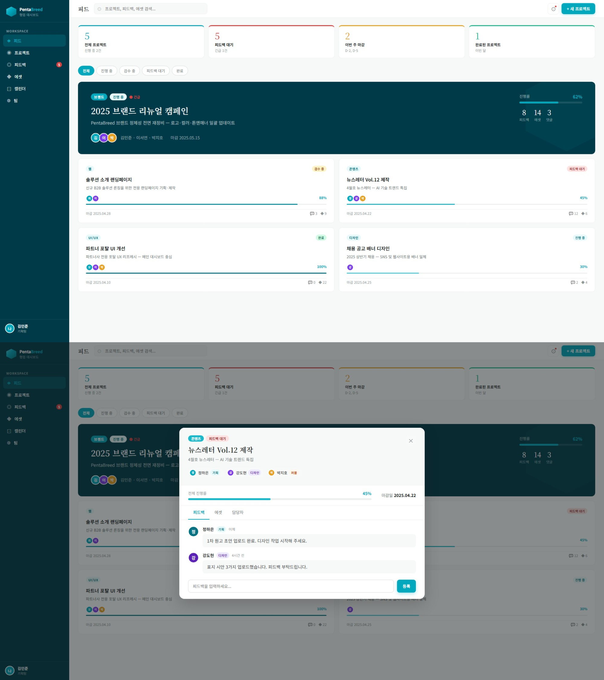 우리 디자인 시스템을 반영해서 사내 기획, 퍼블리셔, 디자이너가 소통할 수 있는 협업 대시보드를 만들어줘.