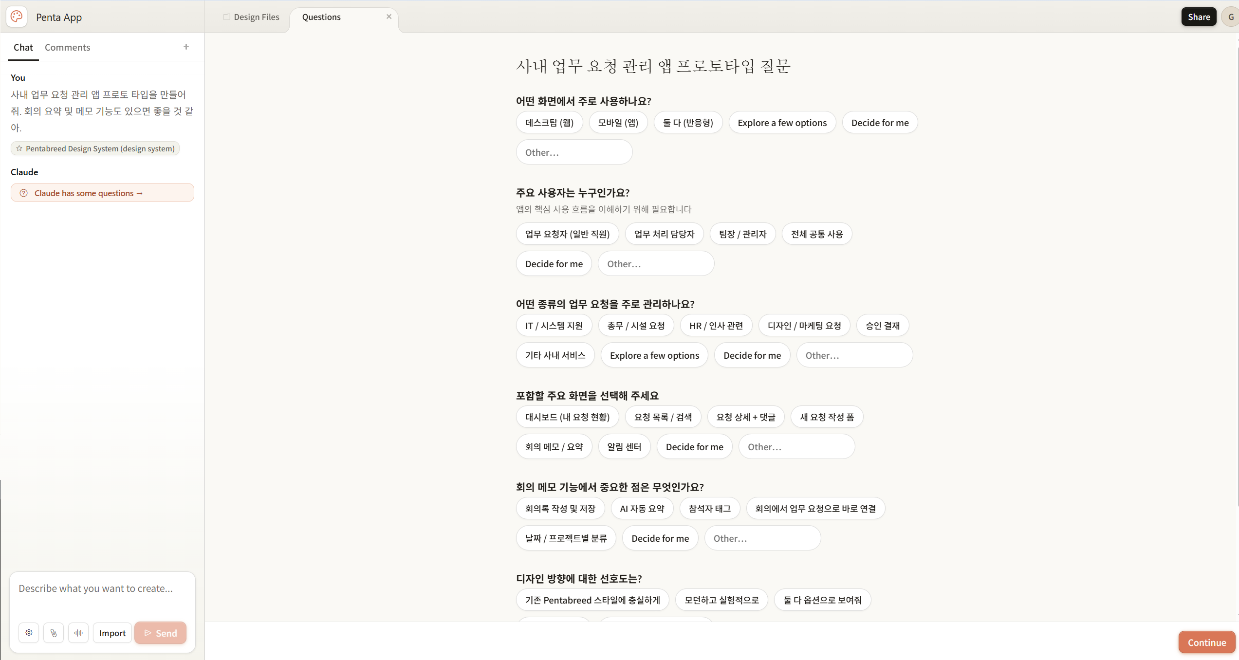 프롬프트 입력을 하면, 몇 가지 추가 질문을 통해 요구사항을 구체화한 뒤 프로토타입을 생성합니다.