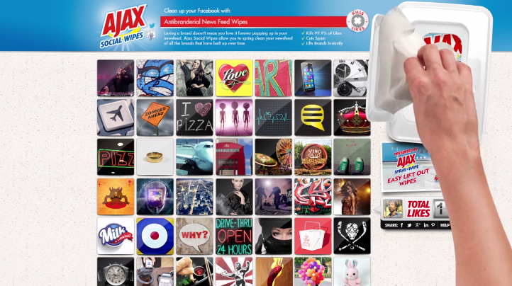 소셜에 피로해져 있는 소비자가 자신의 SNS를 깨끗하게 하는 과정에서 얼룩과 때를 제거해주는 Ajax라는 브랜드를 자연스럽게 인지하도록 하여 단순 광고가 아닌 소비자들에게 직접 유익이 되는 하나의 페이지를 제공한 캠페인이다.